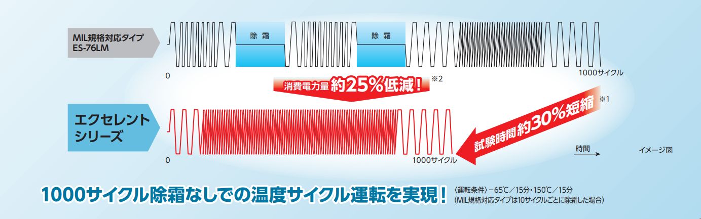 ヒートショック試験において、除霜運転は開発期間の面でもエネルギー消費量の面でも無駄なコストになります。エクセレントシリーズは除霜なしで1000サイクルを連続運転できるようになり、試験時間と消費電力量の低減を実現しました。